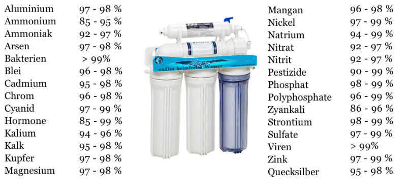 Keime, Bakterien, Herbizide, Fungizide, Nitrat, Nitrit, Uran, Schwermetalle jeglicher Art, Chemikalien, Medikamentenrückstände usw.